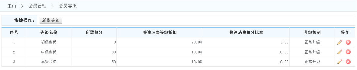 快速消費會員等級信息:快速消費:會員在此等級時,快速消費所能享受的消費折扣. 積分:會員在此等級時,快速消費時自動兌換的積分比率,如:消費10元得1積分|消費20元得1積分|消費50元得1積分。