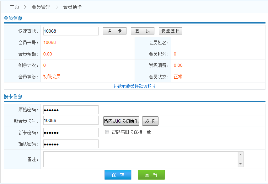 1.當會員卡消磁,損壞,或者遺失的時候,商家可以為會員進行換卡操作,在換卡操作后,系統自動將該會員原始數據同步到新的會員卡信息內.