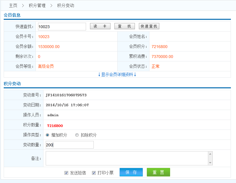 操作流程: 選中會員------>選擇異動類型------>填寫異動數量------>提交保存