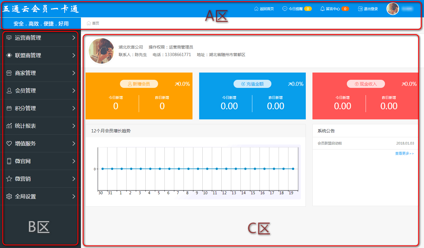 此區(qū)左則顯示系統(tǒng)信息,右側顯示系統(tǒng)公告。下側顯示系統(tǒng)提醒列表(會員生日提醒、積分清零提醒、自定義提醒);