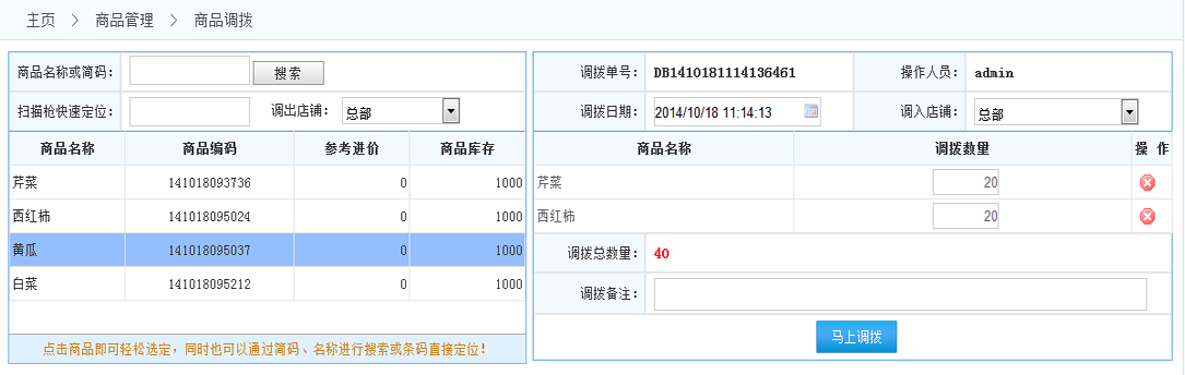 商品調(diào)撥:進入商品調(diào)撥界面, 如下圖: