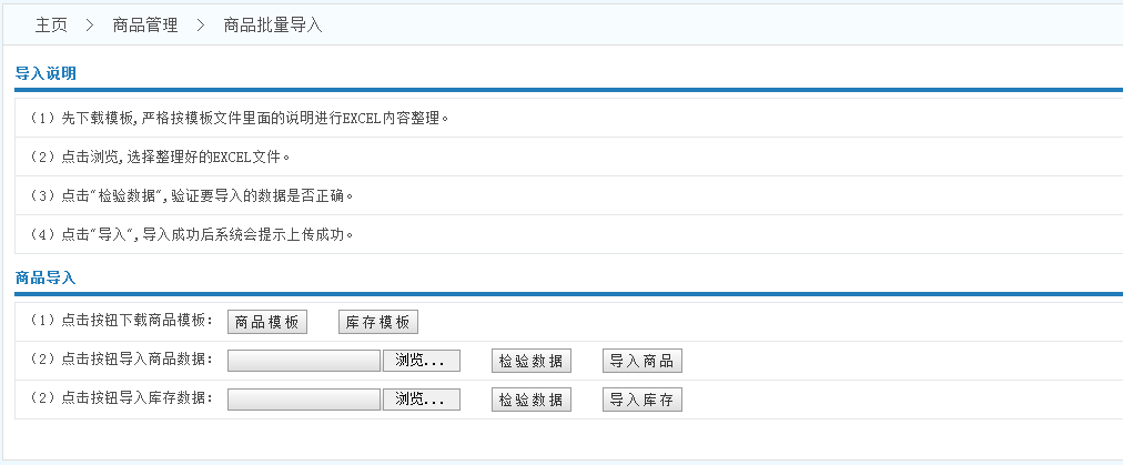 商品模板------>錄入數據------>點擊瀏覽------>檢驗數據------>導入商品------>導入成功