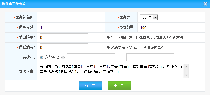 單日使用:單個會員每日限用幾張優惠券,填寫0則不受限制