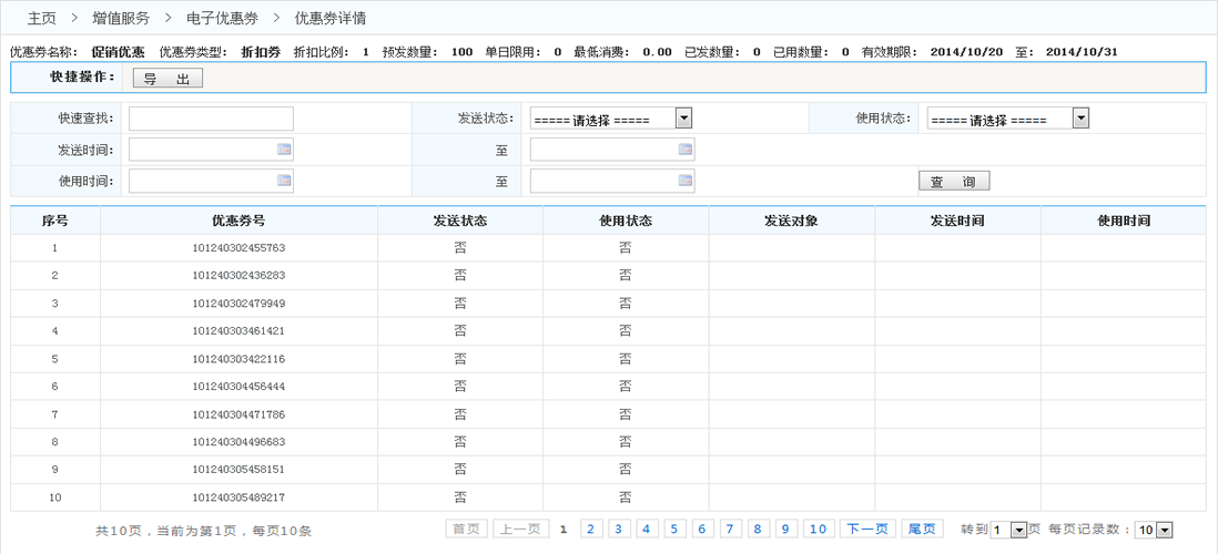 查詢提交:可以根據提供的一些條件分類,查出所需要的數據(包括發送狀態 使用狀態以及時間等條件)